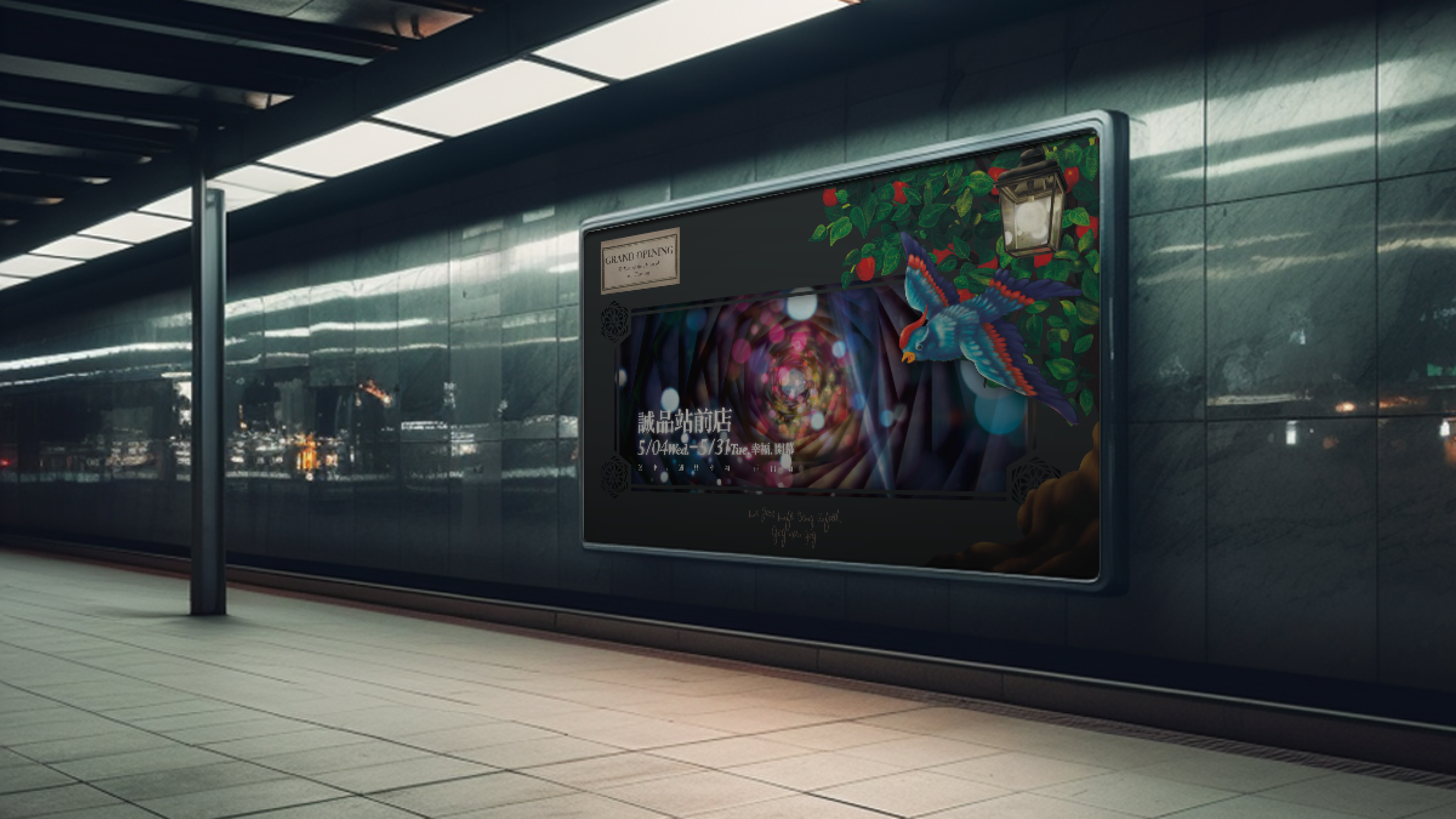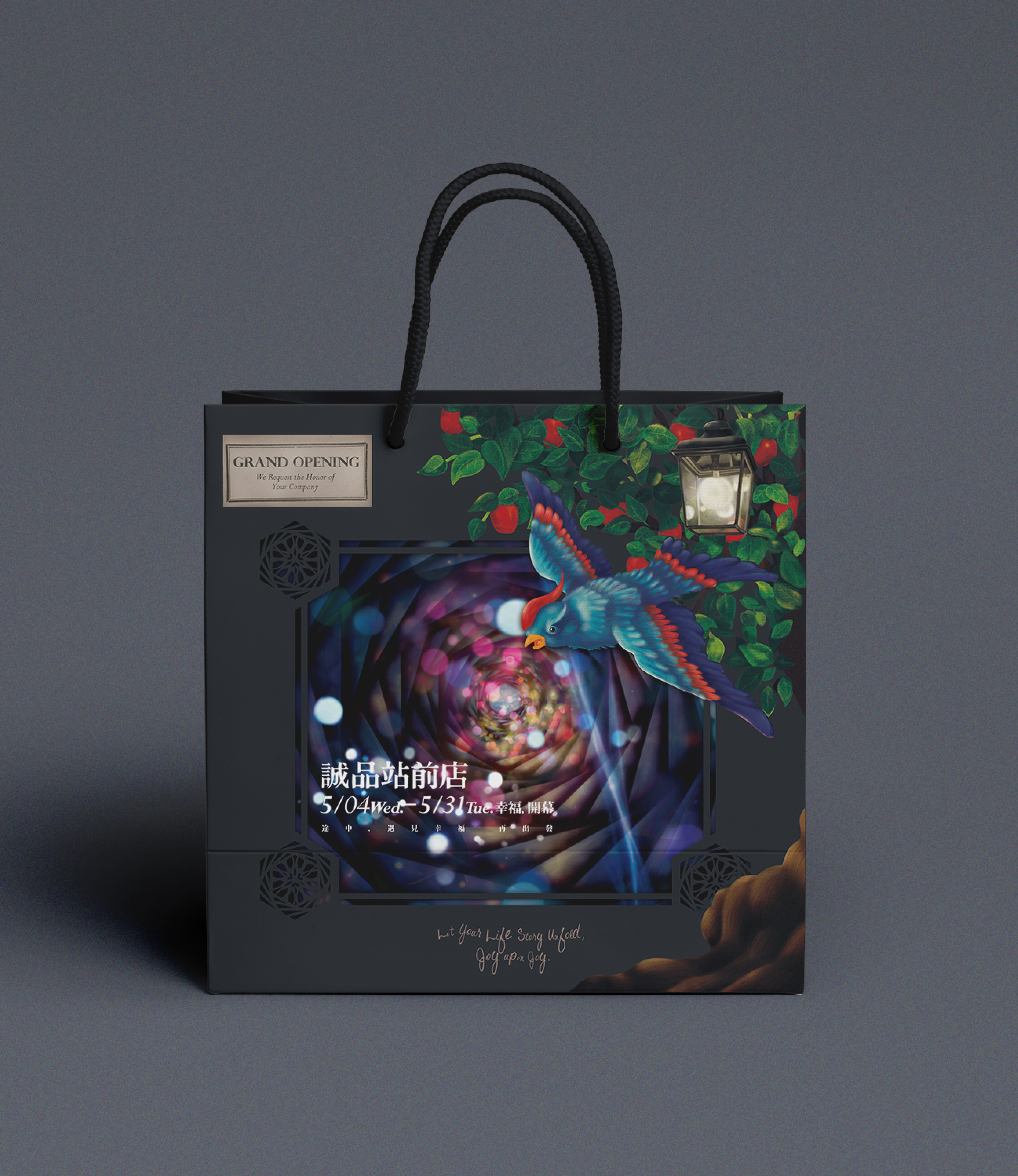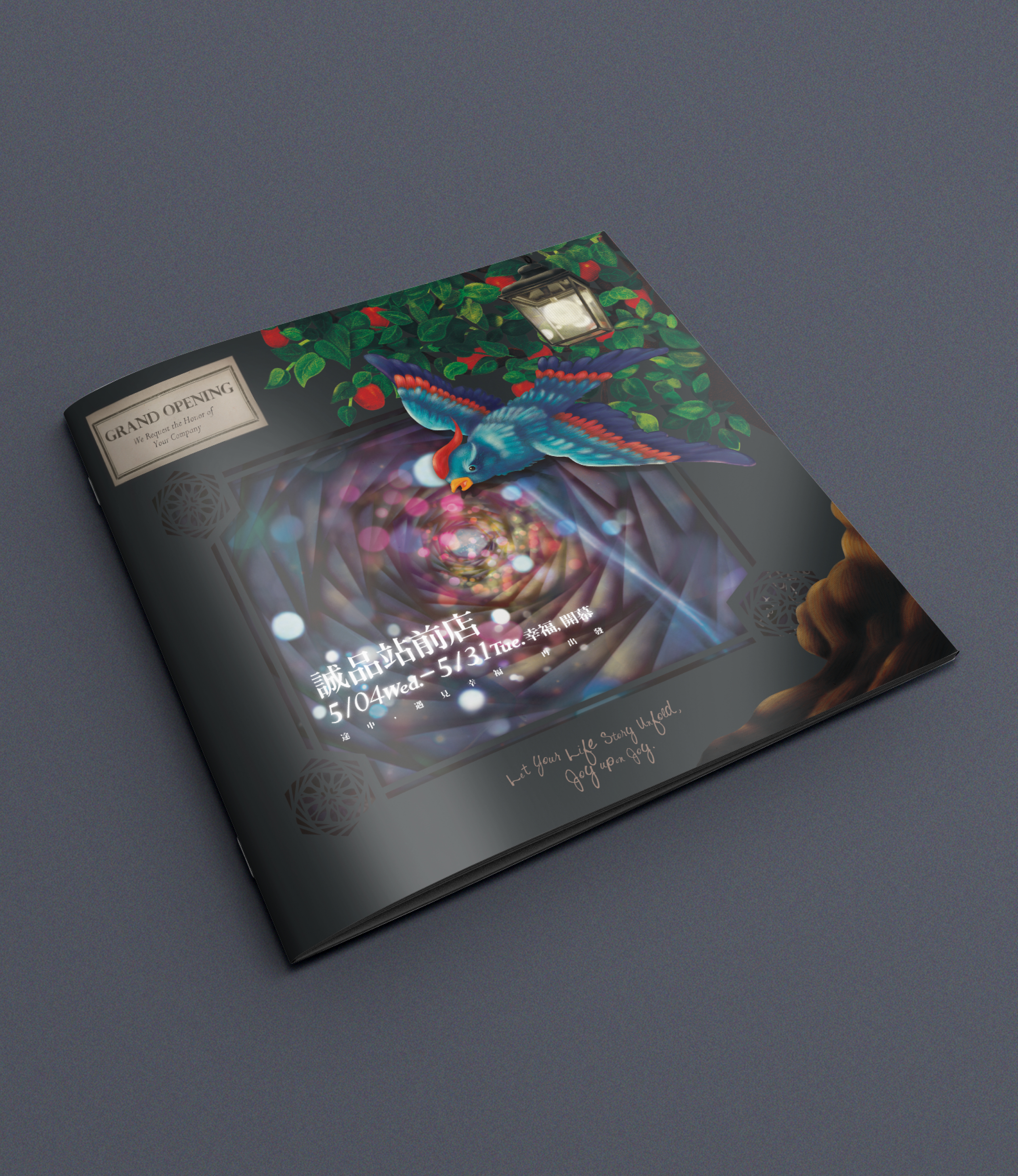 The concept was inspired by the story The Blue Bird (French: L'Oiseau bleu), a tale about the pursuit of happiness. I blended warm light dots in the tunnel view with a joyful atmosphere, incorporating illustration elements like a blue bird representing happiness, an apple tree symbolizing good fortune, and a specially designed lamp for the store, emphasizing Eslite’s role in "lighting up your life."