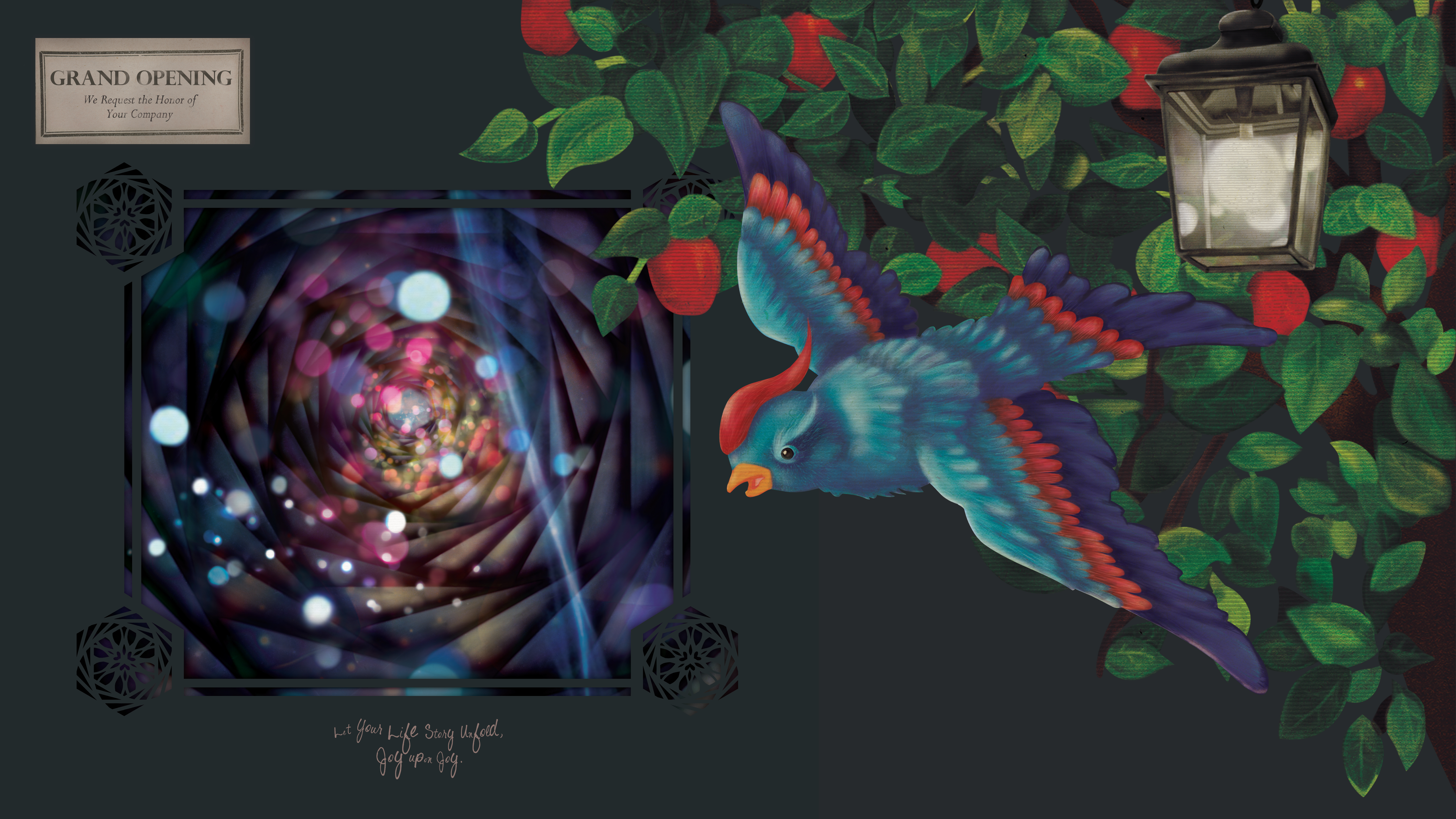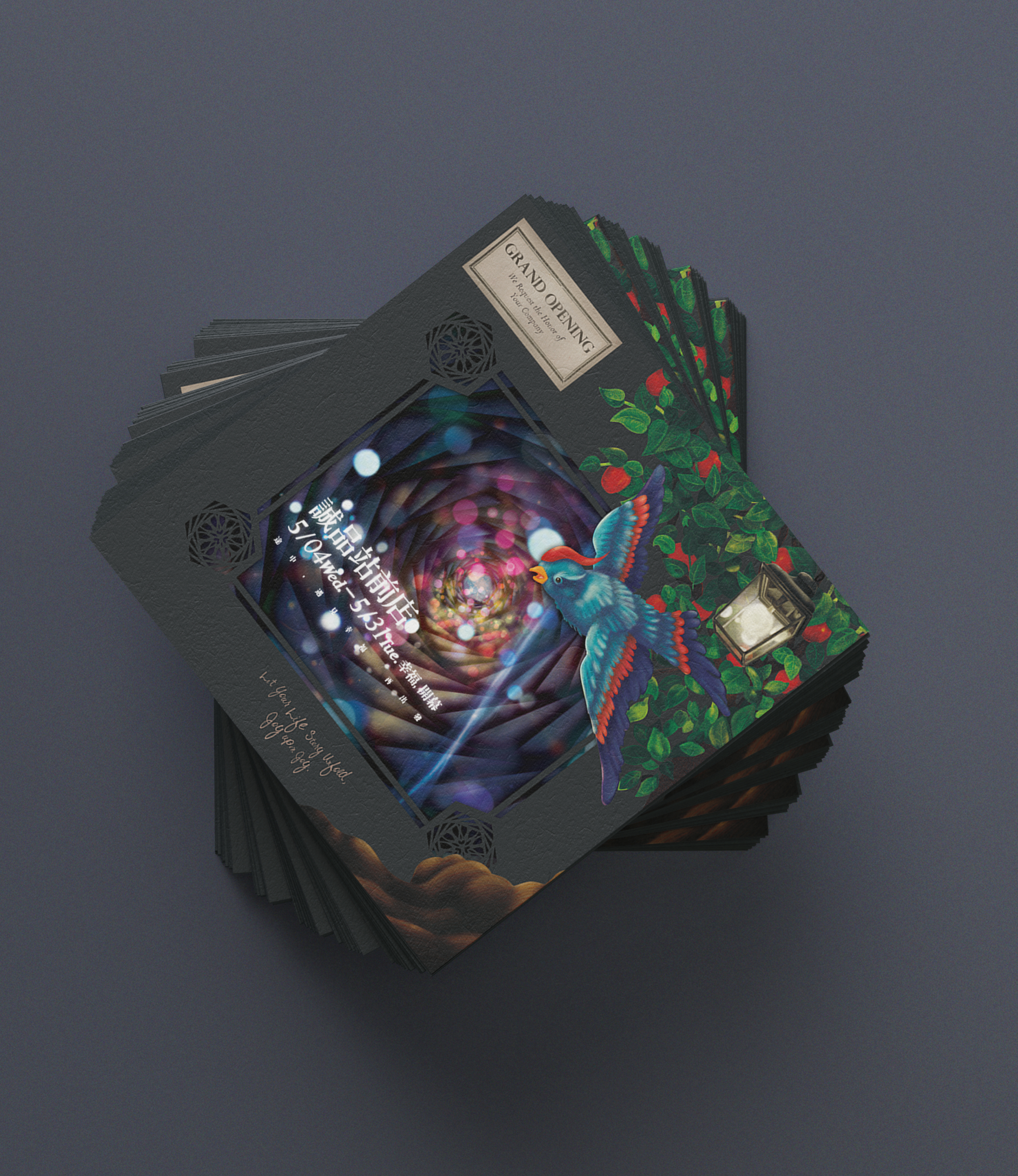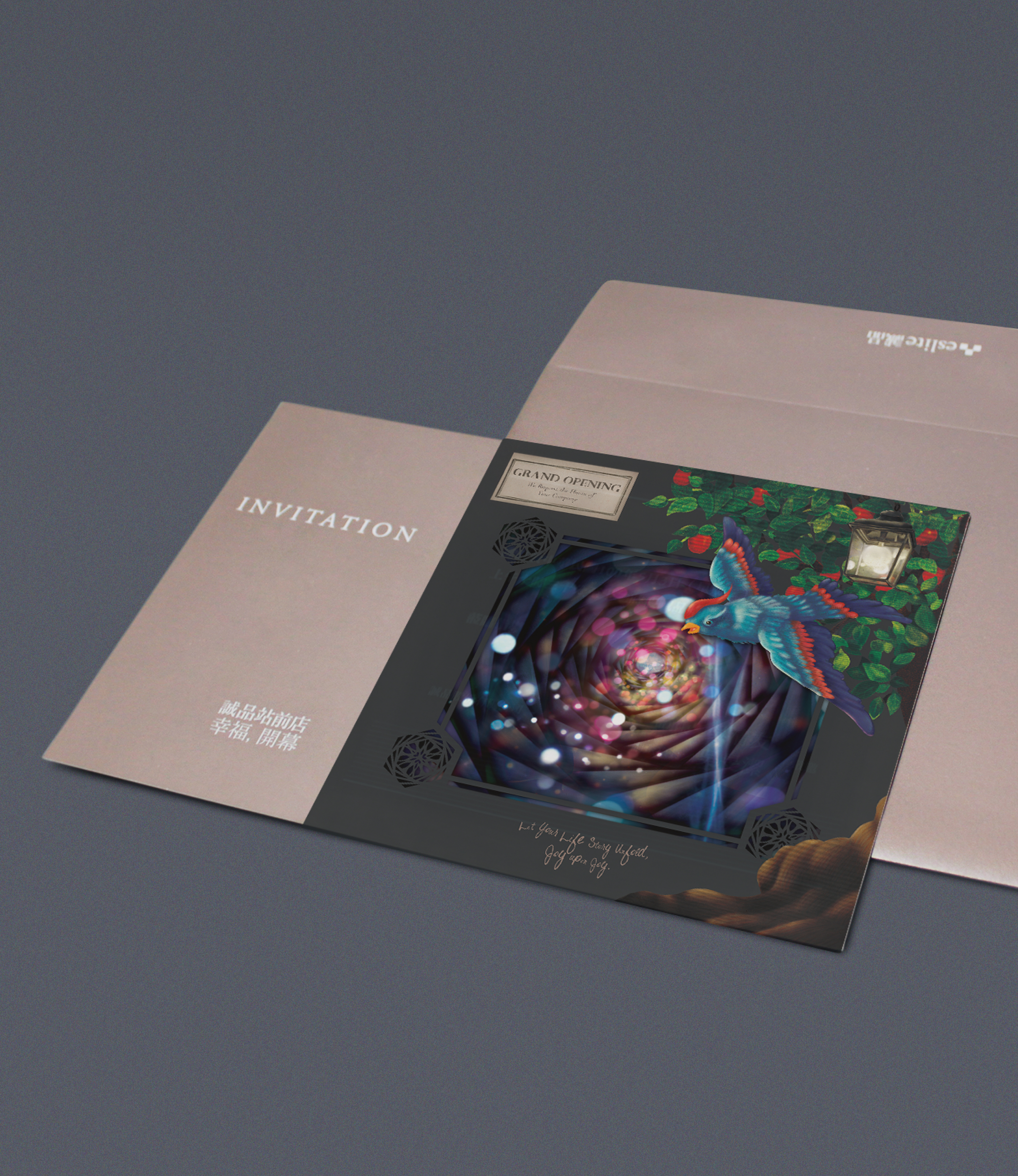 The concept was inspired by the story The Blue Bird (French: L'Oiseau bleu), a tale about the pursuit of happiness. I blended warm light dots in the tunnel view with a joyful atmosphere, incorporating illustration elements like a blue bird representing happiness, an apple tree symbolizing good fortune, and a specially designed lamp for the store, emphasizing Eslite’s role in "lighting up your life."