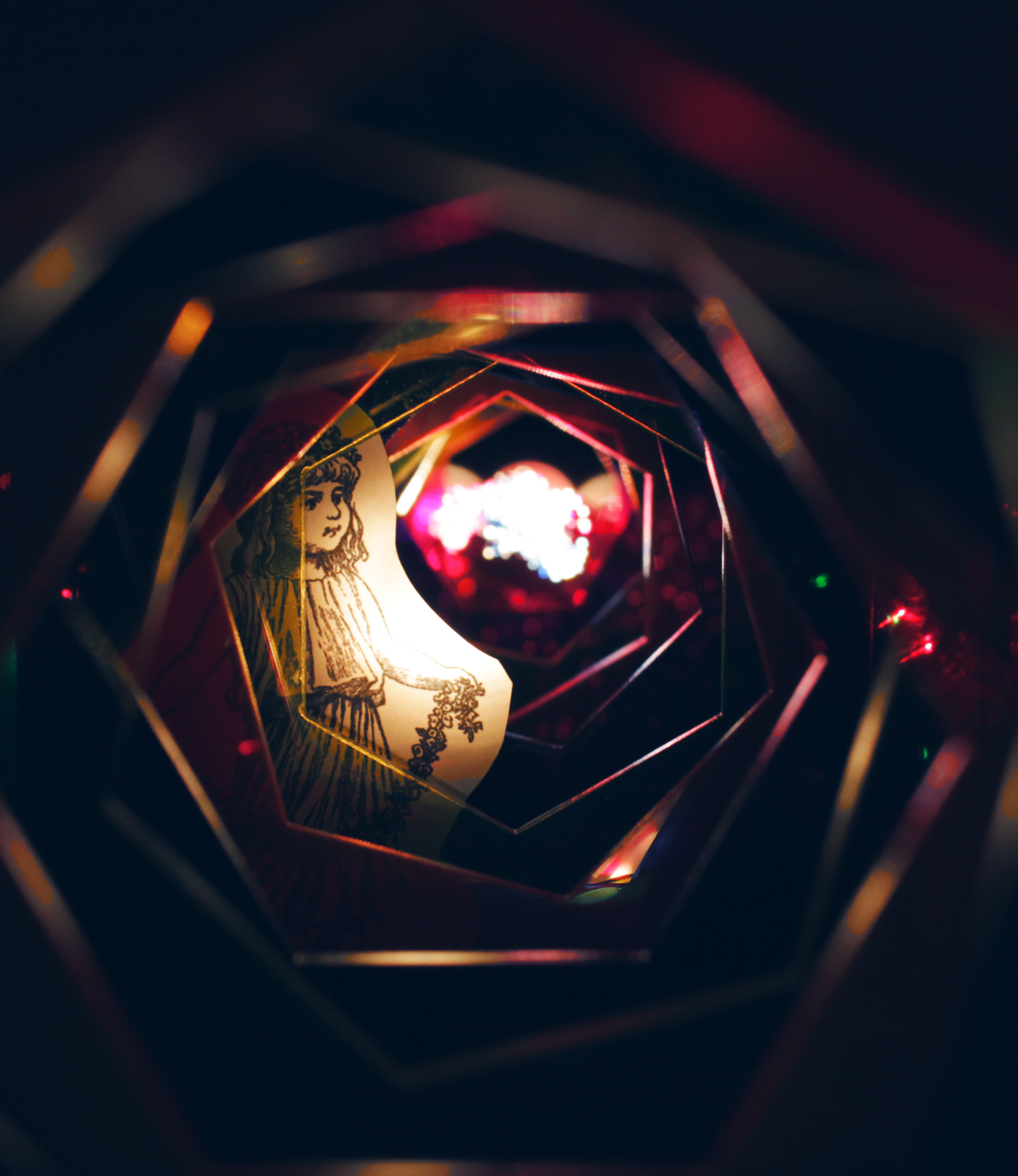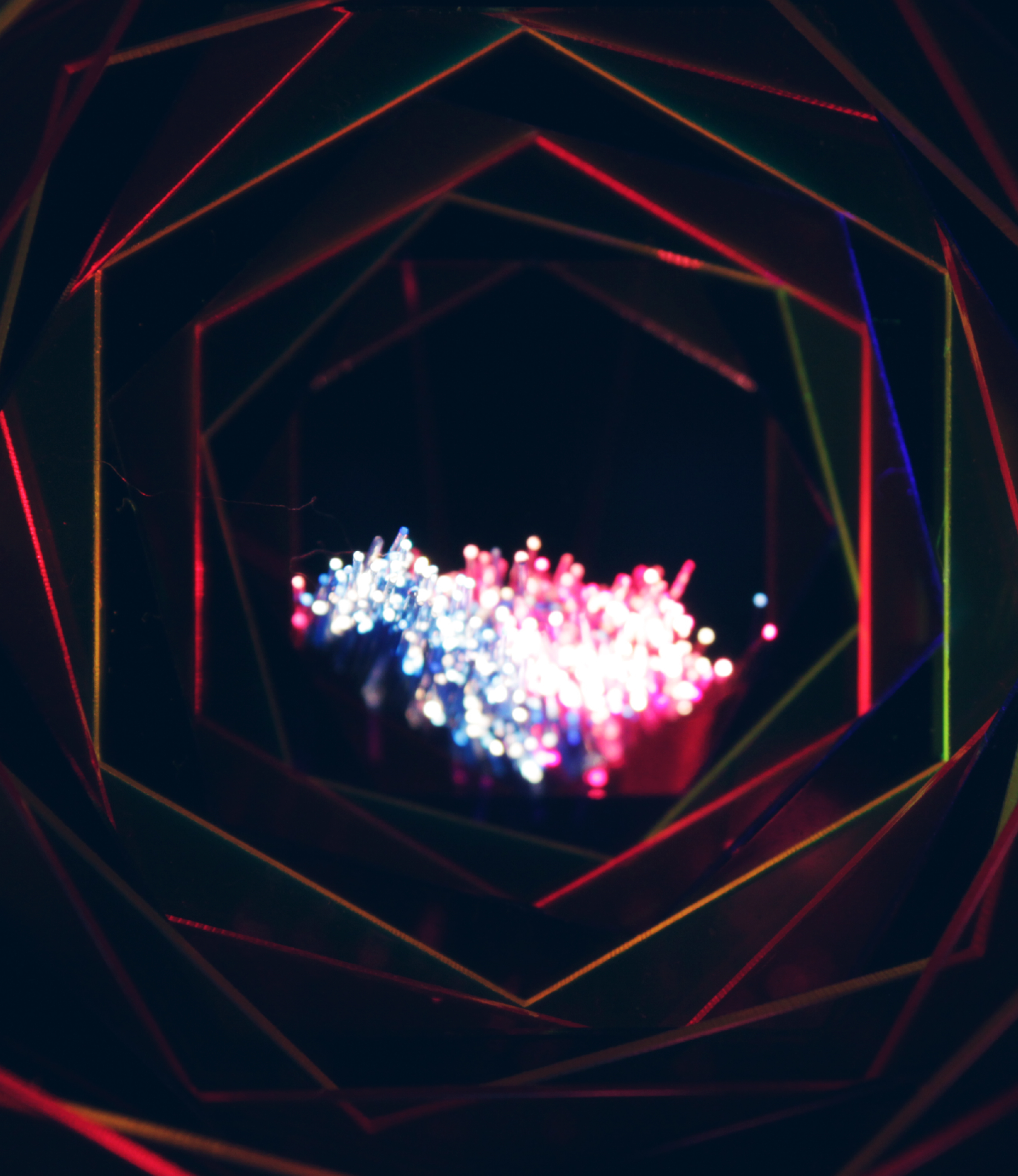 Before finalizing the key visual, I experimented with LED light transmission through 15 sequentially reduced and rotated hexagonal acrylic glass pieces, exploring how light refracted through the constructed tunnel scene.