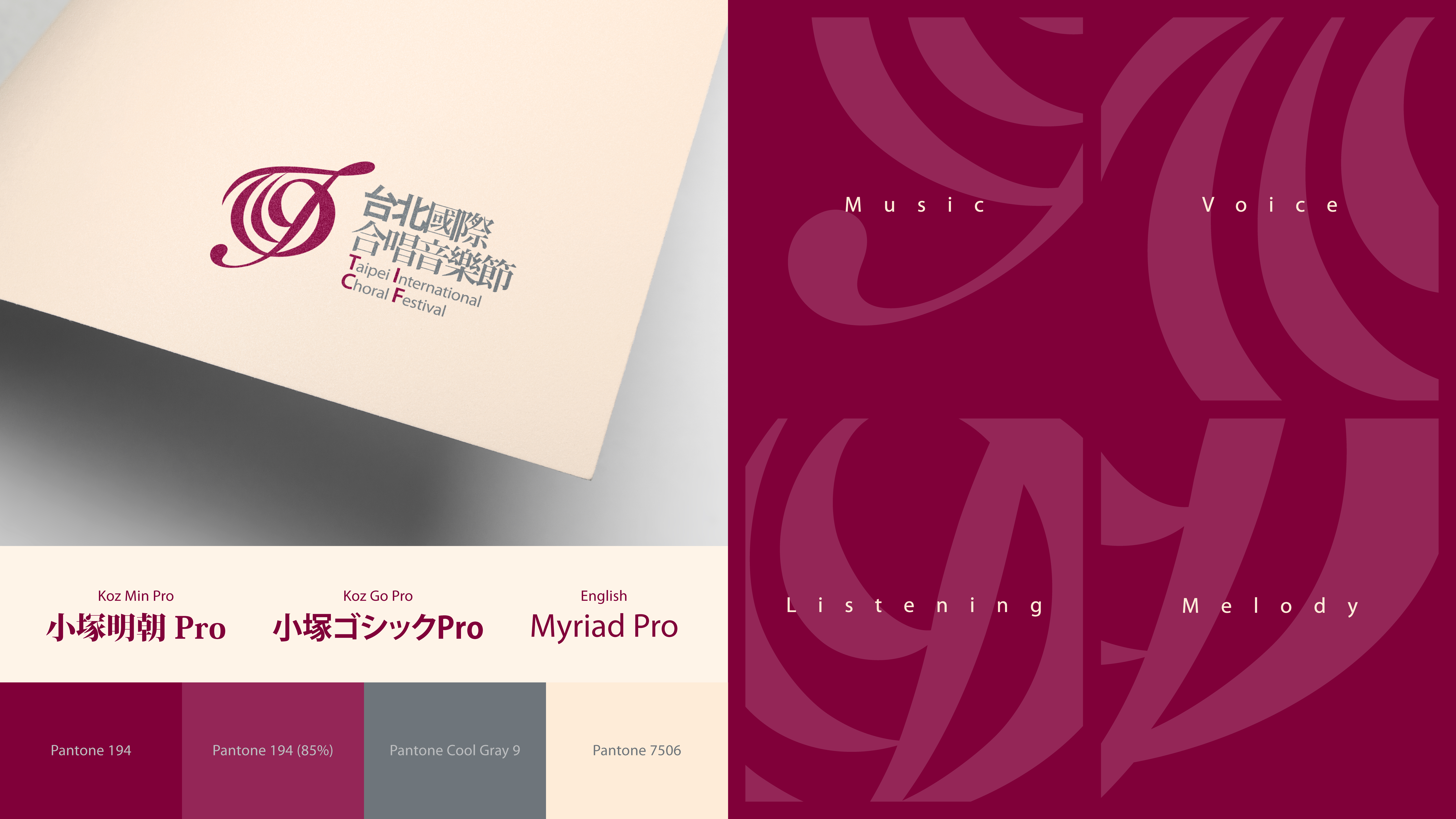The primary identity colour is adapted from the brand colour of the event organizer, the Taipei Philharmonic Foundation for Culture and Education, as per their request. Two additional secondary colours are included for broader applications.